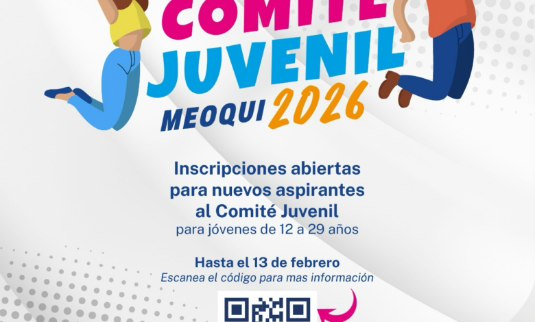 La Presidencia Municipal de Meoqui, a través del Instituto Municipal de Deporte y Juventud, dio a conocer que se encuentra abierta la convocatoria para integrar el Comité Juvenil dirigido a jóvenes de 12 a 29 años, con una fecha límite de inscripción el 13 de febrero, un espacio de participación ciudadana que busca fortalecer la voz, el liderazgo y la participación de las y los jóvenes en el desarrollo del municipio.