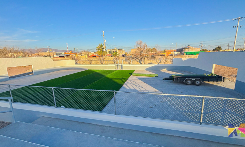 Avanza en Meoqui la ejecución de obras de infraestructura educativa, por concluir en esta ocasión la construcción de una cancha de fútbol rápido en la Escuela Secundaria Técnica No. 39 de la cabecera municipal, donde actualmente se encuentran instalando el pasto sintético.