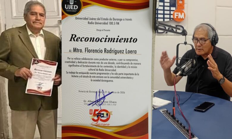 El Mtro. Florencio Rodríguez Loera, originario de Meoqui, Chihuahua, fue reconocido por la Universidad Juárez del Estado de Durango por su destacada trayectoria como productor y conductor de un programa radiofónico en Radio Universidad, labor que ha desempeñado durante más de una década.