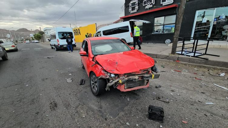 La mañana de este miércoles se registró un fuerte accidente vial en el cruce de la avenida Juan Escutia y América Latina, en la ciudad de Chihuahua. El choque involucró a tres vehículos y terminó con una camioneta de transporte de personal incrustada en un negocio de llantas y rines.
